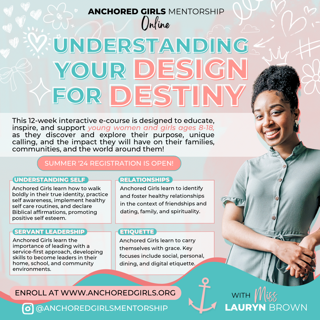 This 100% ONLINE Summer Session of Anchored Girls Mentorship is a 12-week program, which will run from June 3rd through August 22nd, 2024.